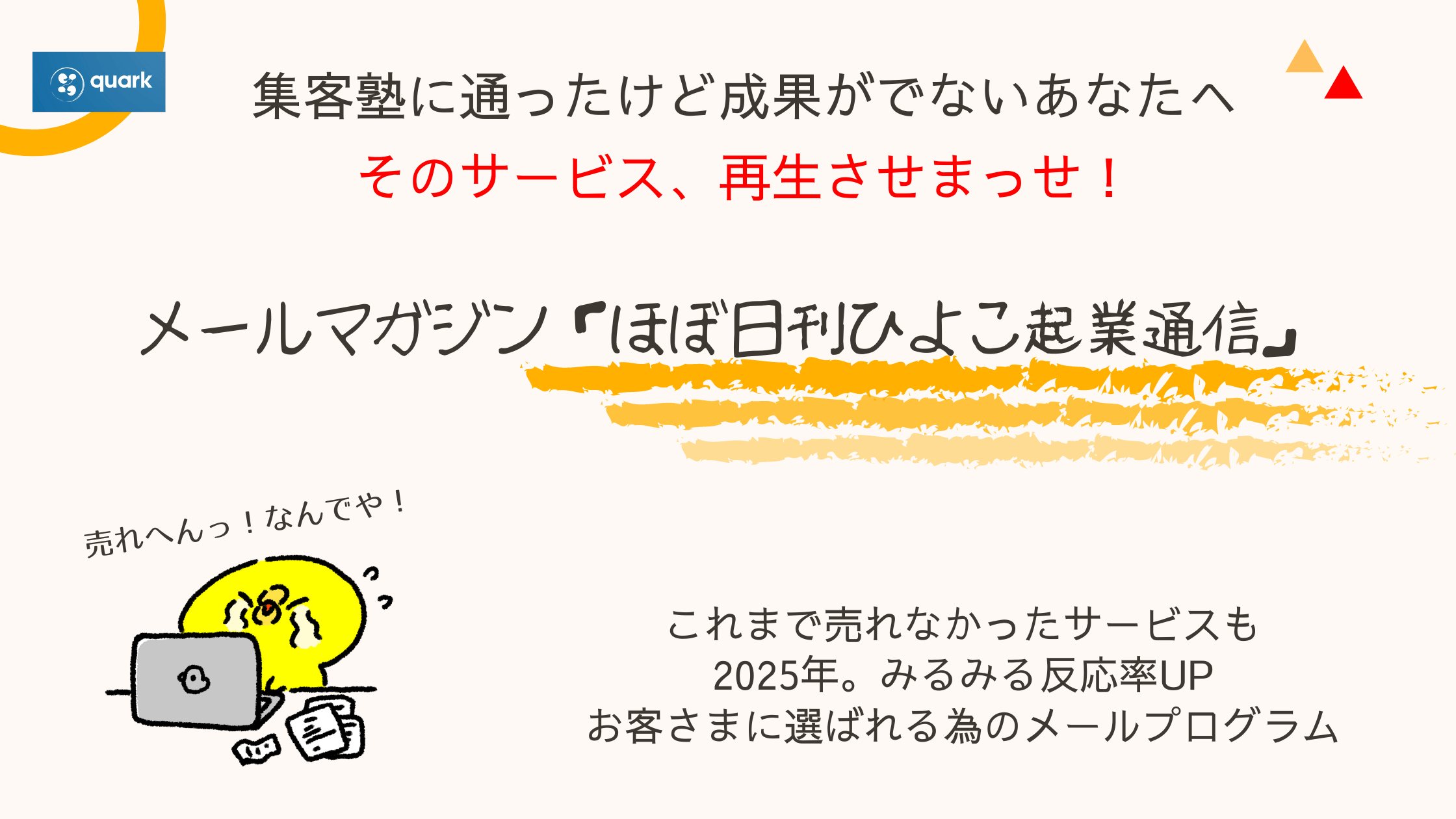本メルマガでは集客から成約に至るまでに必要な工夫と、99%の起業塾が教えていない事業継続のコツを教えちゃいます。